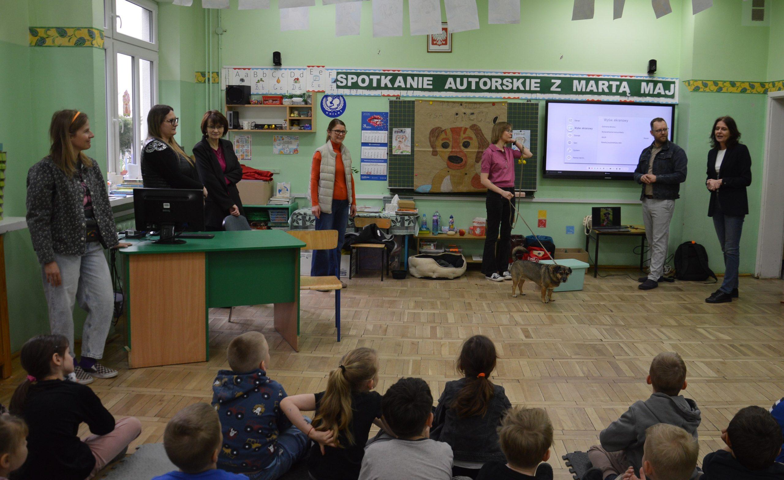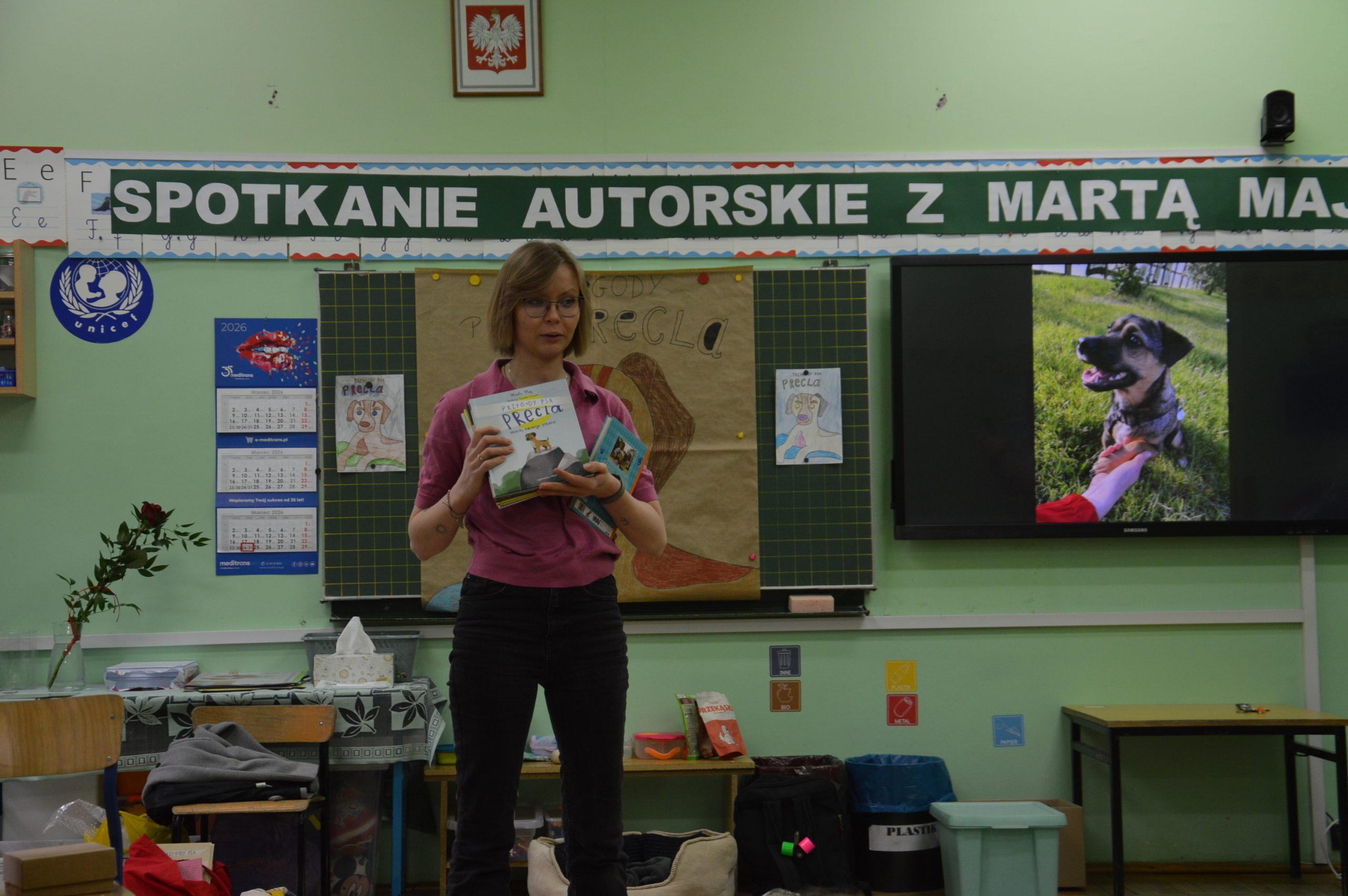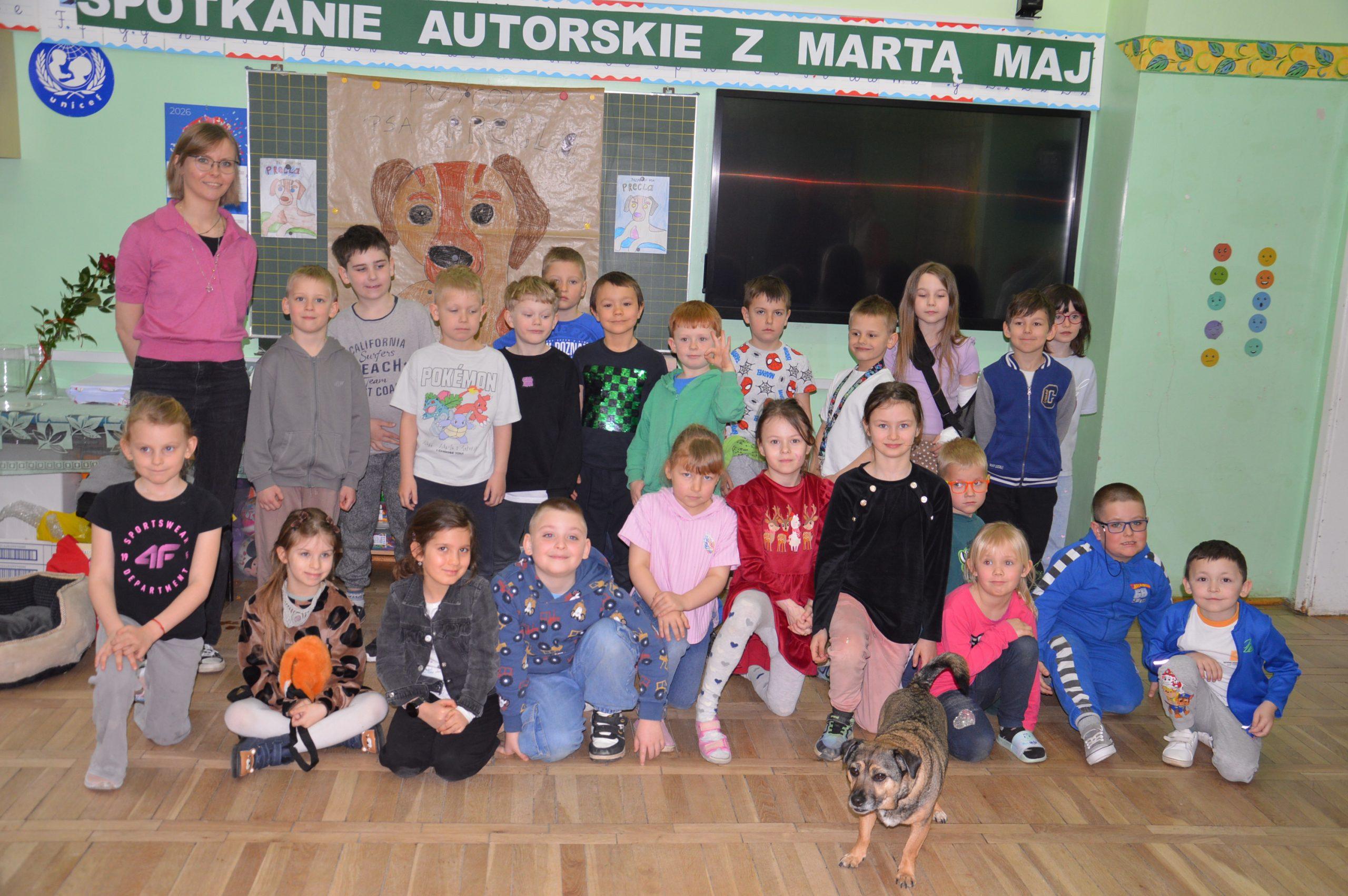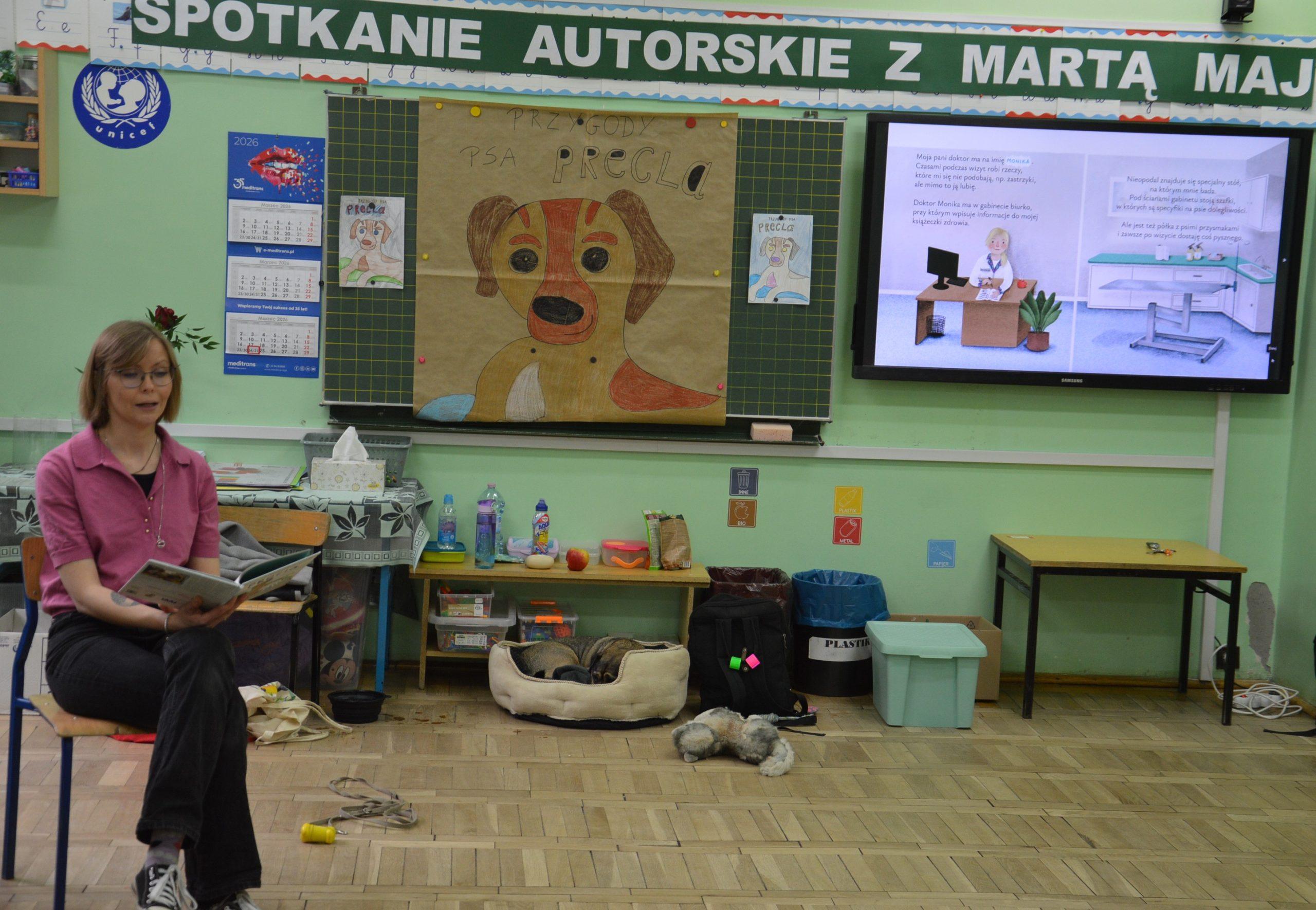Dnia 24.03.2026r. w klasach 0A i 0B odbyło się niezwykłe spotkanie autorskie z Panią Martą Maj  oraz psem Preclem, bohaterem serii książek dla dzieci „Przygody psa Precla”.
