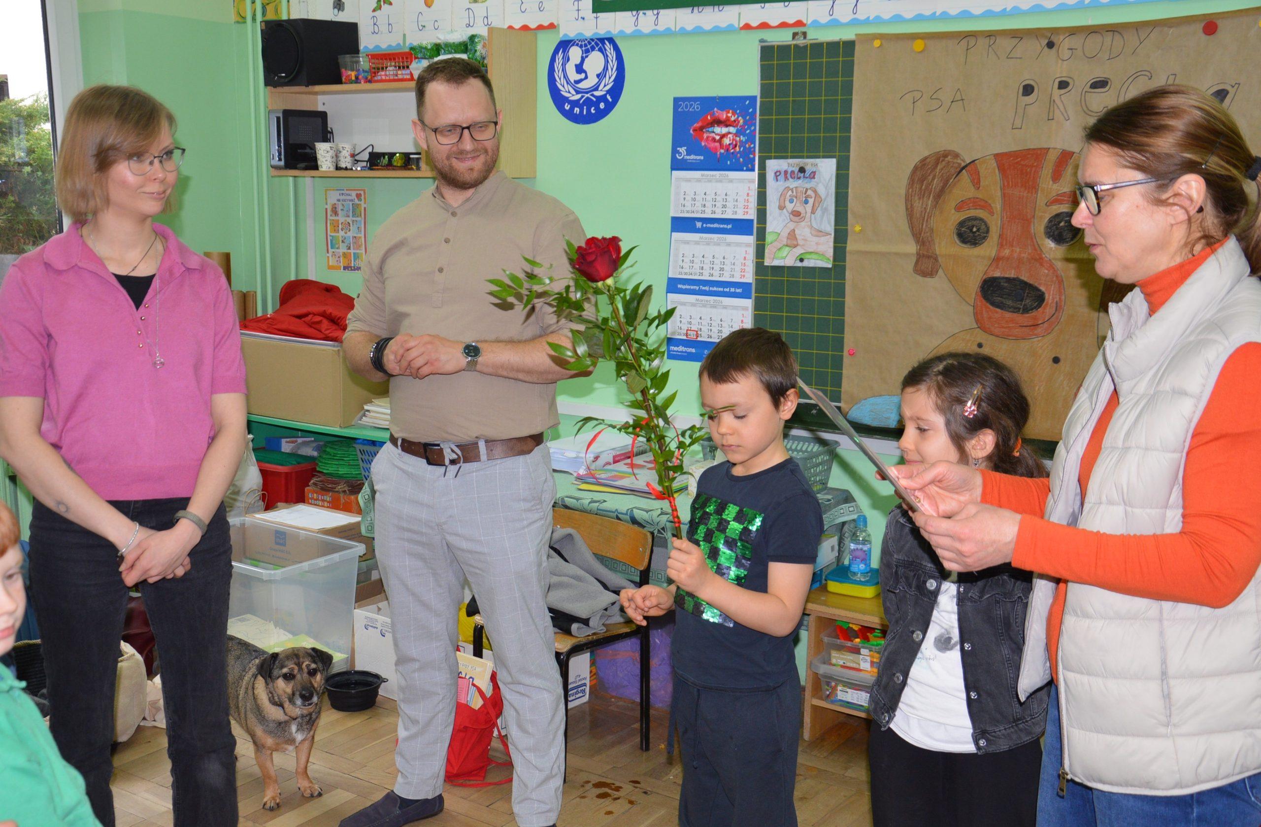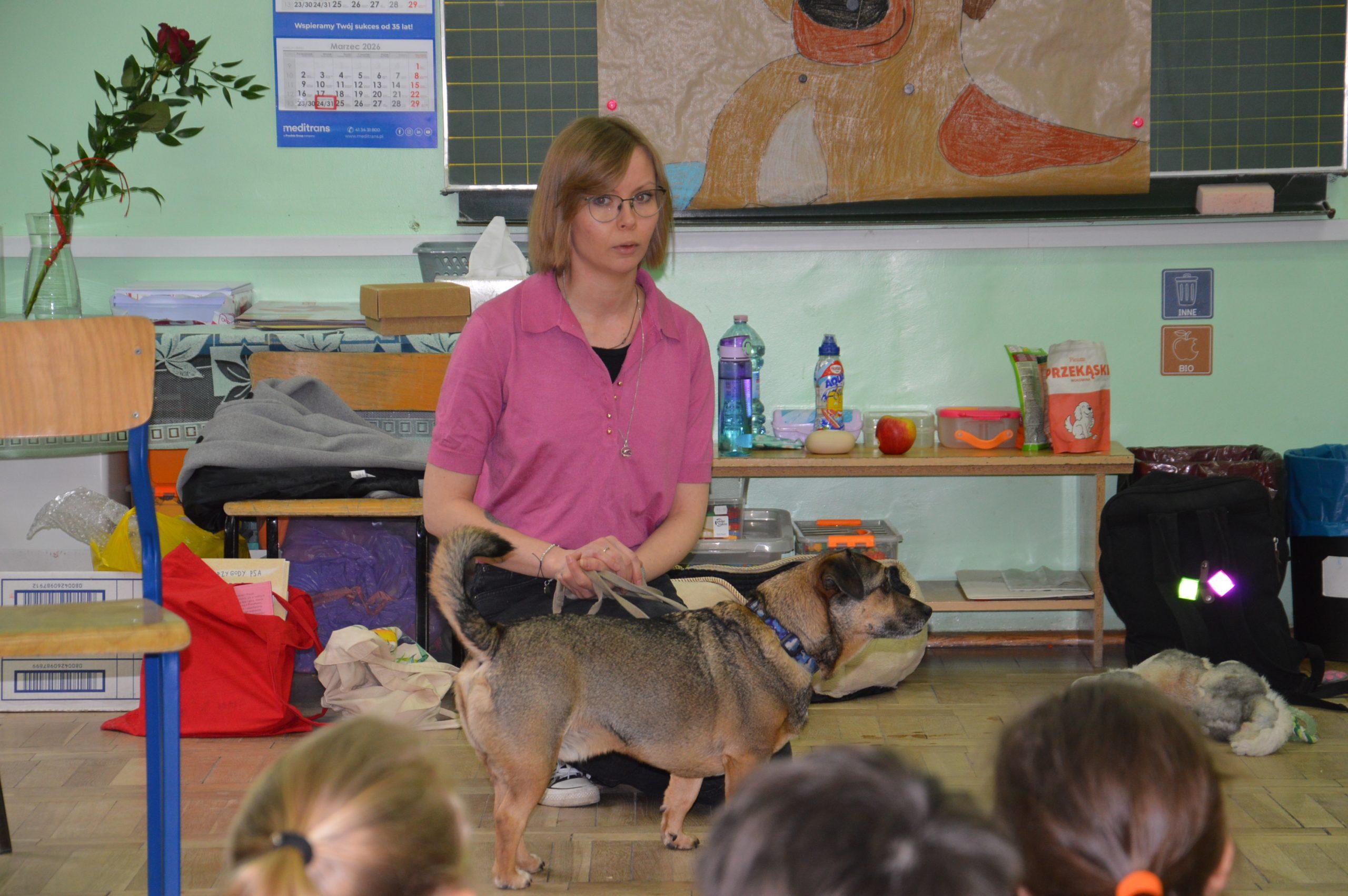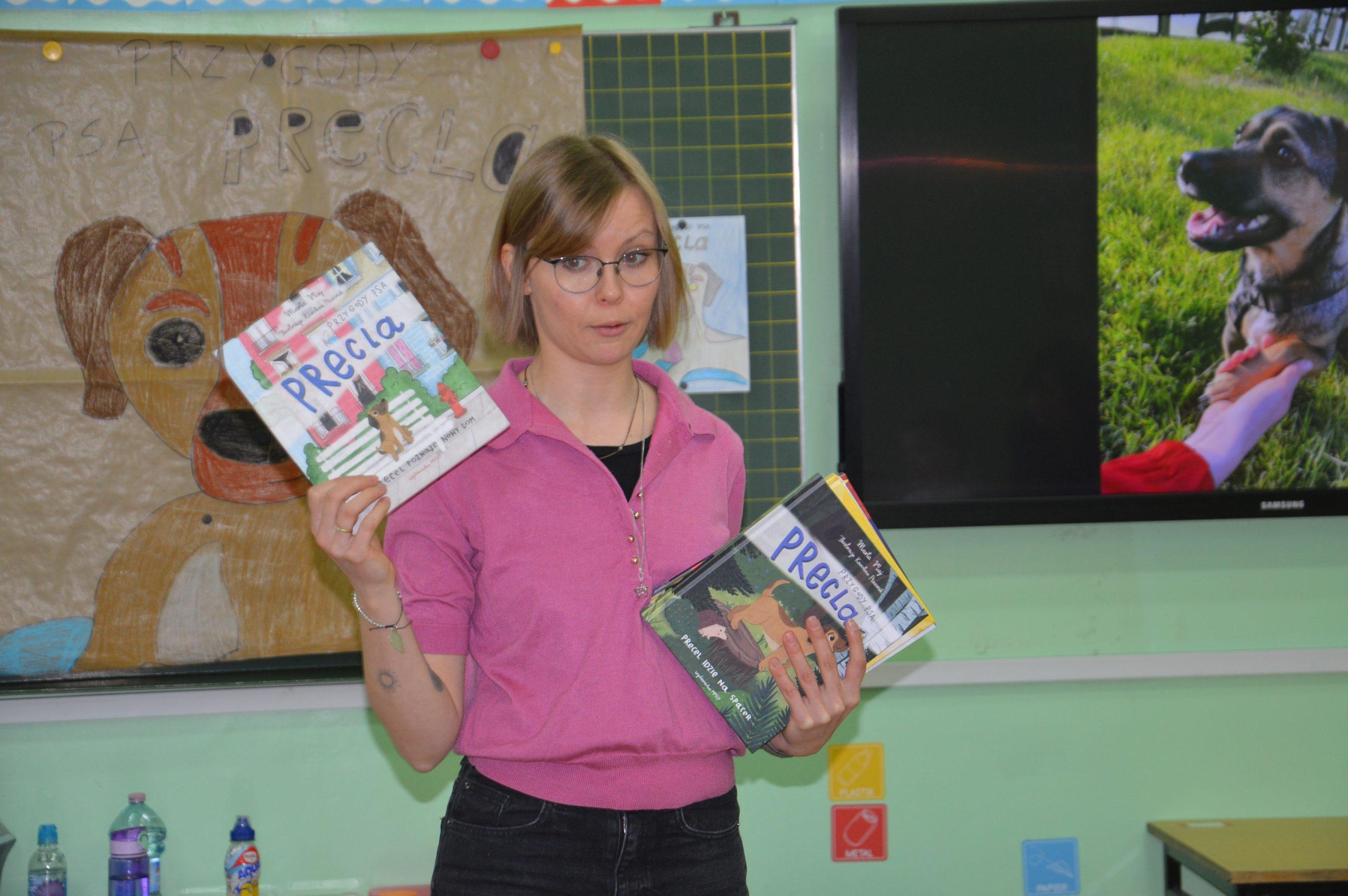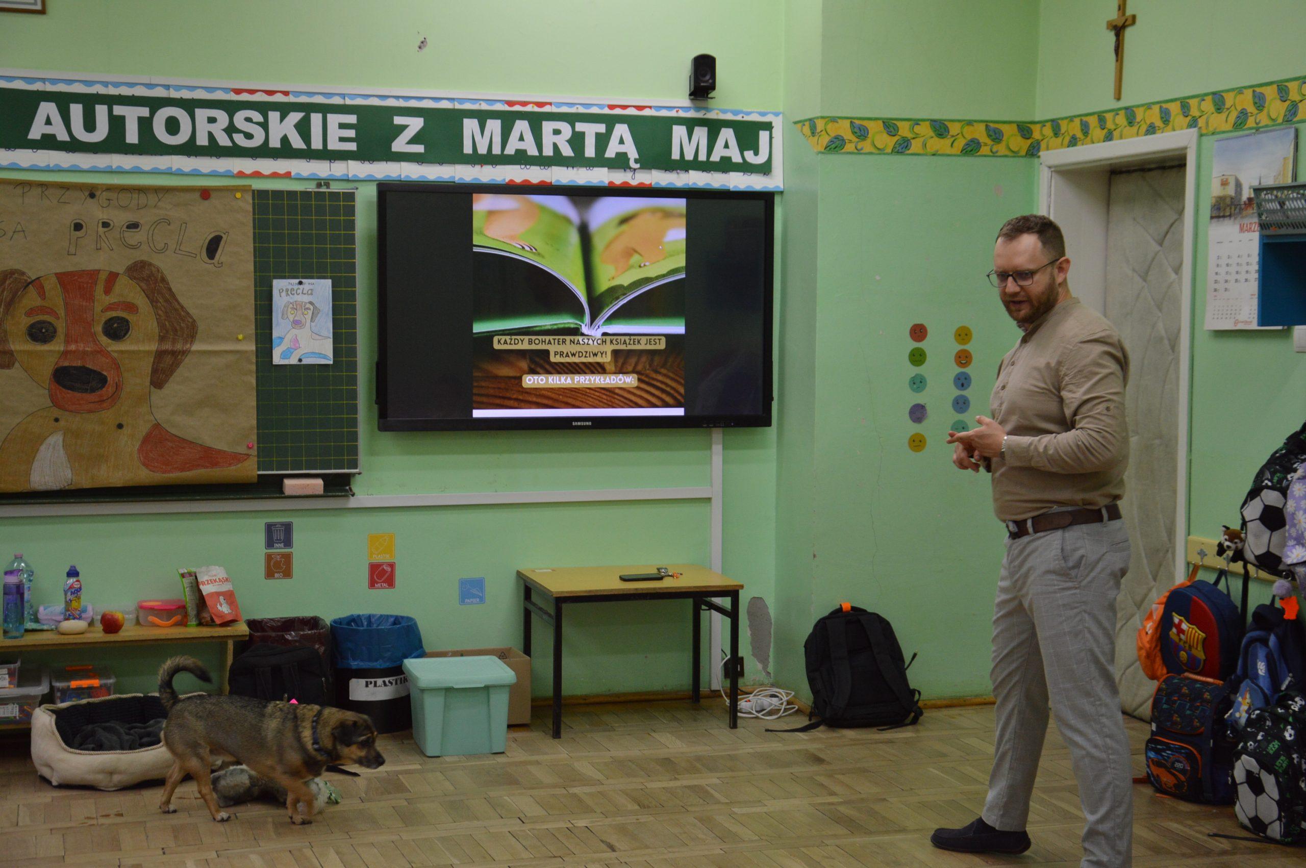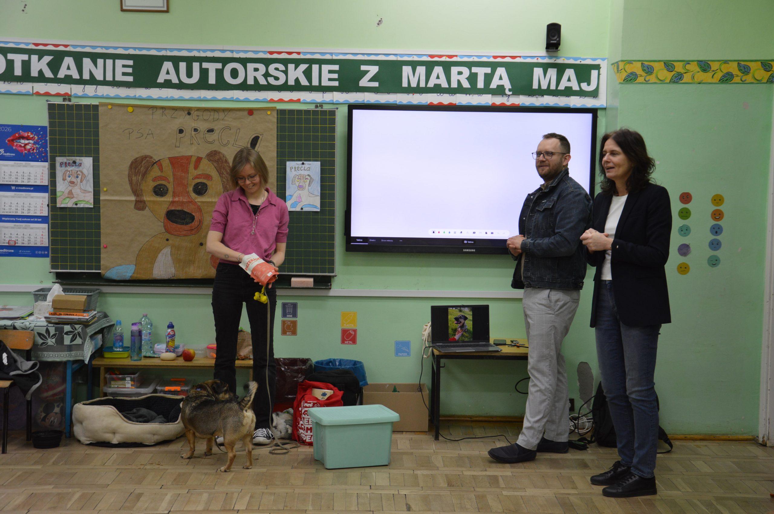 Dnia 24.03.2026r. w klasach 0A i 0B odbyło się niezwykłe spotkanie autorskie z Panią Martą Maj  oraz psem Preclem, bohaterem serii książek dla dzieci „Przygody psa Precla”.